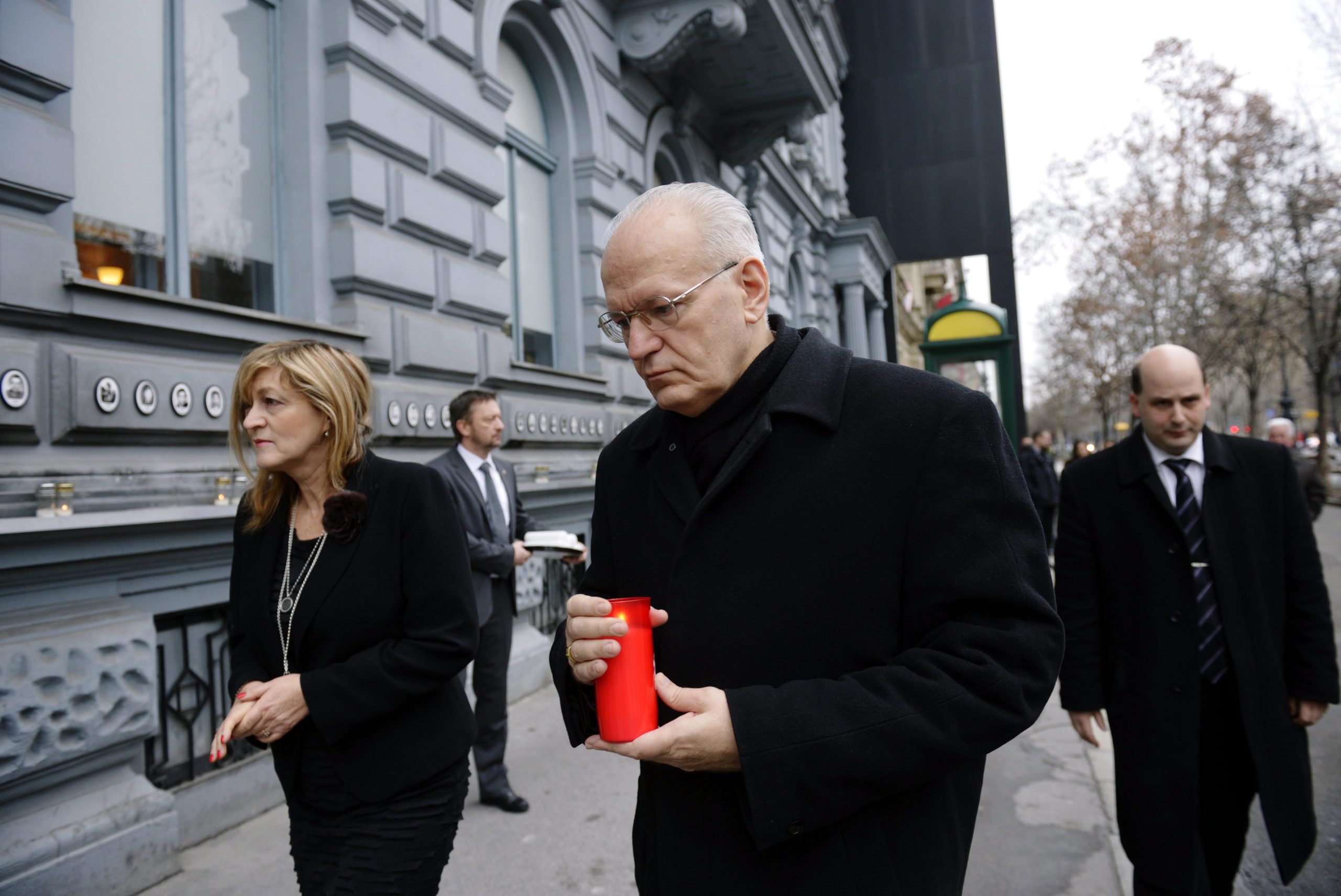 Az Oktogontól a múzeumig vezető járda mentén végig mécsesek égnek. A délelőtt folyamán folyamatosan érkeztek emlékezők a múzeumhoz.