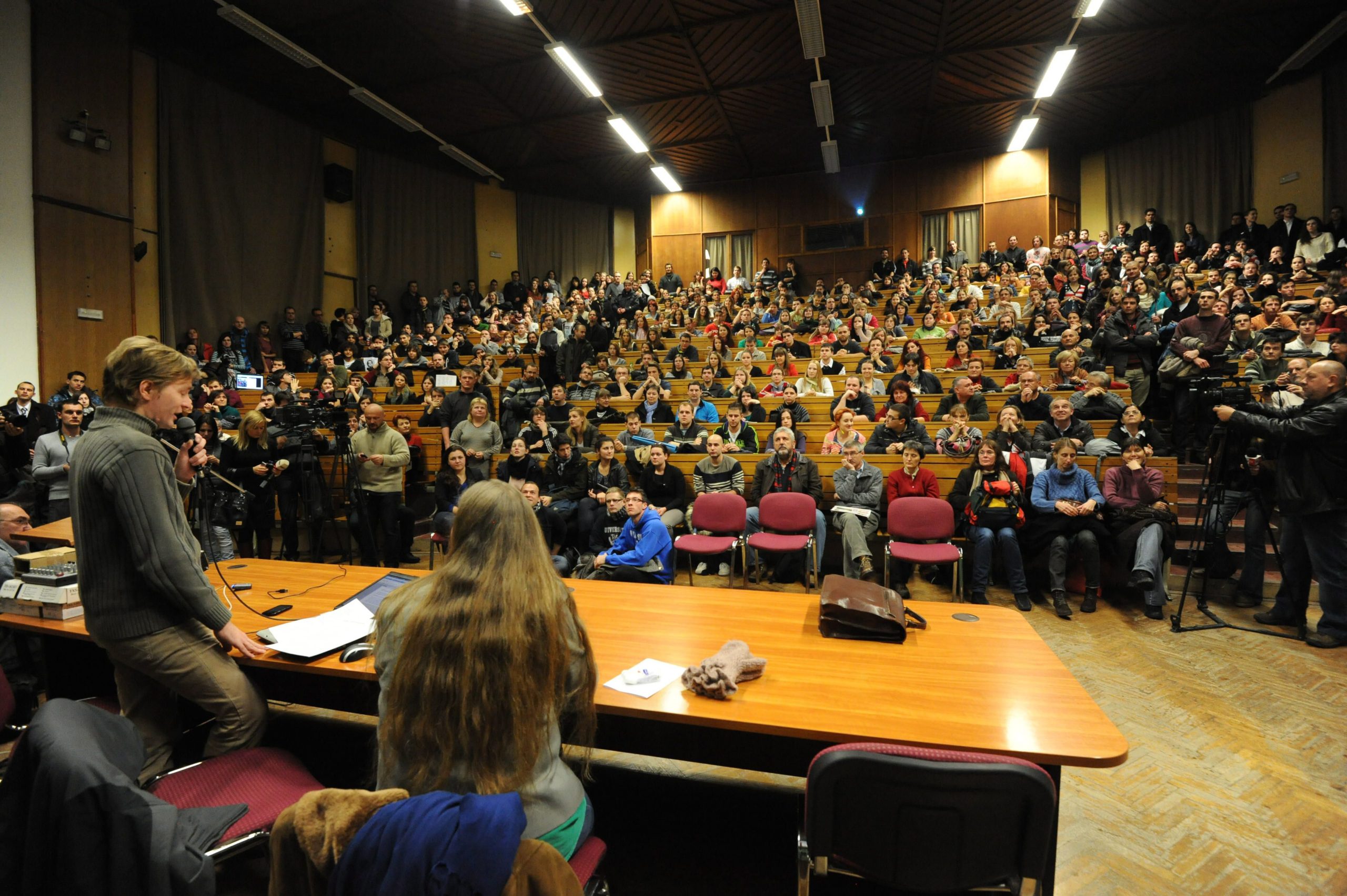Eközben a Szegedi Tudományegyetem auditórium maximumában nyílt fórumot tartottak, amelyen részt vett az SZTE szinte valamennyi dékánja és az intézmény rektora, Szabó Gábor akadémikus is.