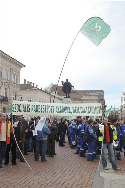 A demonstráción mintegy négyszázan vettek részt, sok dolgozó a cégcsoport formaruháját viselte, kezükben szakszervezeti zászlókat lobogtattak, és egy „Szociális párbeszédet akarunk, nem diktátumot” feliratú transzparenst feszítettek ki.