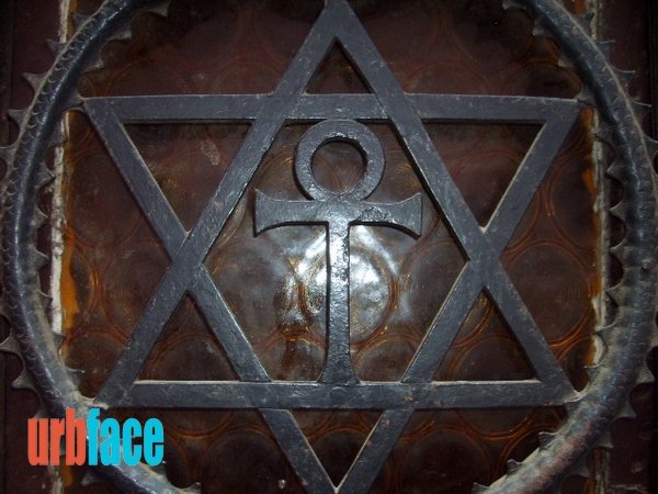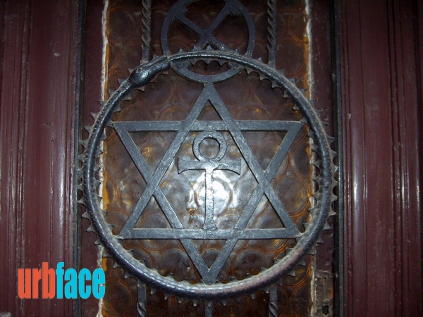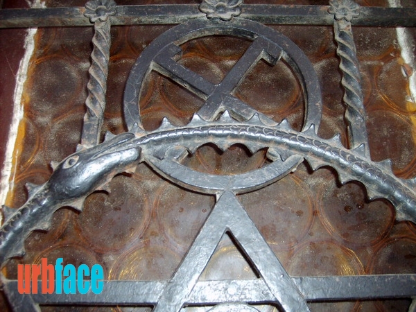 Miután a szervezet berendezkedett a házban, a bejárati szárnyas ajtóra rögtön felhelyezték a társaság kovácsoltvas szimbólumát, a szemnyugtató szimmetria miatt rögtön kettőt. A két dísz egy-egy farkába harapó, a bölcsességet szimbolizáló kundalíni kígyót ábrázol, amelyeknek a közepén az életet jelképező ANKH egyiptomi kereszt és a köré font kettős háromszögek feszülnek. Ez az összetett szimbólumrendszer a szellemnek az anyagba szállását és felemelkedését jelképezik. A Salamon pecsétjeit körbefogó uroboroszok felett látható szvasztikákat 1948-ig a társaság jelmondata, a „Nincs magasztosabb vallás az igazságnál” vette körül. Aki nincs tisztában a szimbólumok jelentésével, az most ledöbbenhet, hogy e két Kazinczy utcai Dávid-csillag felett egy-egy horogkereszt látható, de e két jelképnek most speciel semmi köze sincs se a zsidósághoz, se a nácikhoz. Több ok miatt se. A Szentmarjay-csoport 1914-ben költözött el innen a VIII. kerületi Eszterházy (ma Puskin) utca 19. szám alá. Ilyen izgalmas kaput Budapesten csak fent a várban, az Úri utca 52. szám alatti Zenegg-palotánál látni.