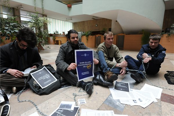 A hallgatók a kormányhivatal aulájában ülnek, lábuknál egy hosszú lánccal összekötve. Többüknél transzparensek láthatók többek között „10 480 állami finanszírozott hely. Nem. Nem engedünk a kormánynak” felirattal – tapasztalta a helyszínen az MTI tudósítója.